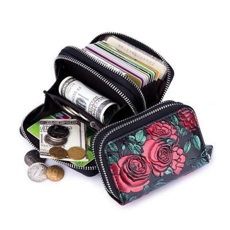 Мода Кожа Женщины Держатель кредитной карты Кошелек Двойная молния Большая емкость 3D Роза Цветок Пе